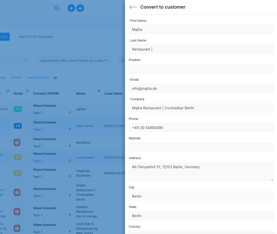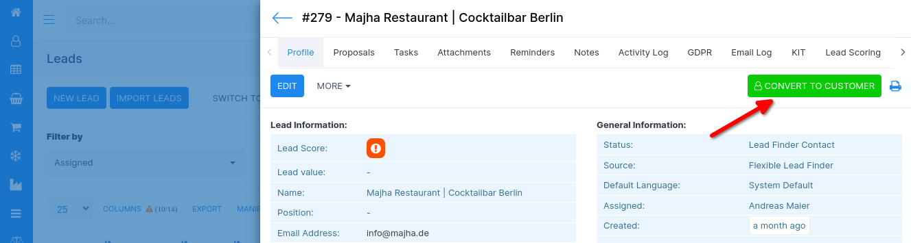 Convert to Customer: In the top right corner of the lead slide-in panel, locate and press the "CONVERT TO CUSTOMER" button. This signifies your intent to transition the lead into a customer record.
