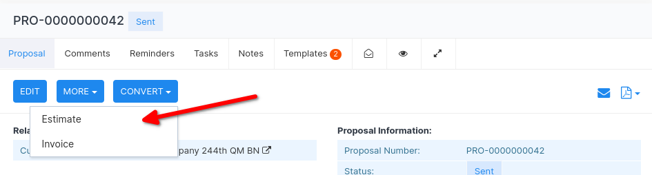 Click on the CONVERT button to proceed with the conversion process. Upon clicking, you will be presented with options to choose the type of document you wish to convert the proposal into: an Estimate or an Invoice.