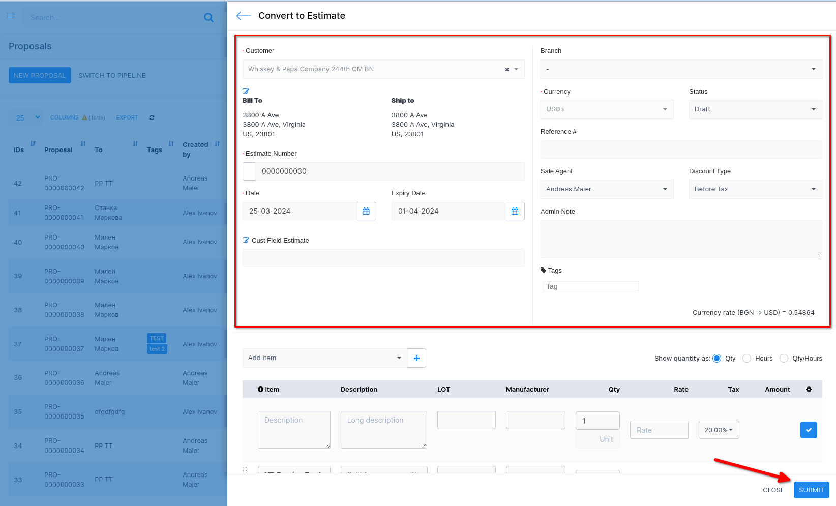 If you are satisfied with the preview and the details, click SUBMIT to finalize the conversion. This action creates an estimate or invoice based on the selected proposal.