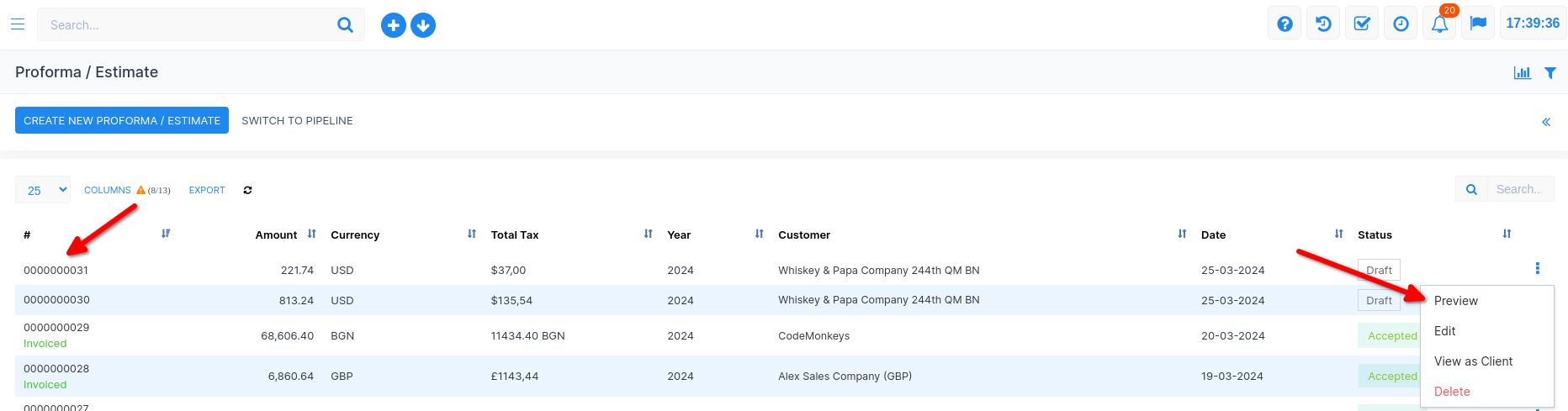 To preview an estimate in split-view, click either the estimate number or the action menu located on the right side of each list item.