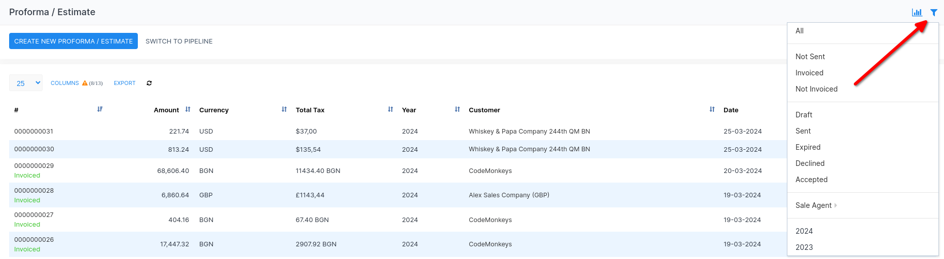 By Invoice Status: Distinguish between estimates that have been invoiced and those that haven't, streamlining the financial tracking and follow-up processes.