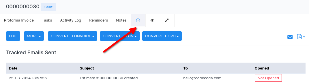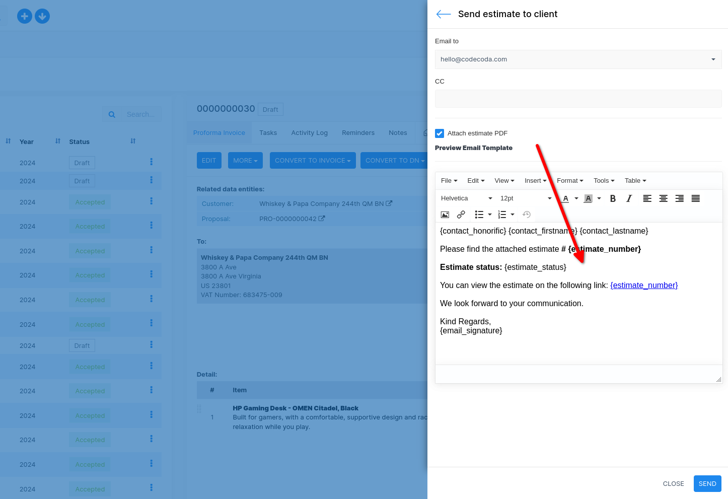 The Mail Icon: Positioned on the right side within the detail view of your estimate, the mail icon serves as your conduit for communication. Clicking this icon opens a pop-up window, showcasing a preview of the email template set for dispatch.