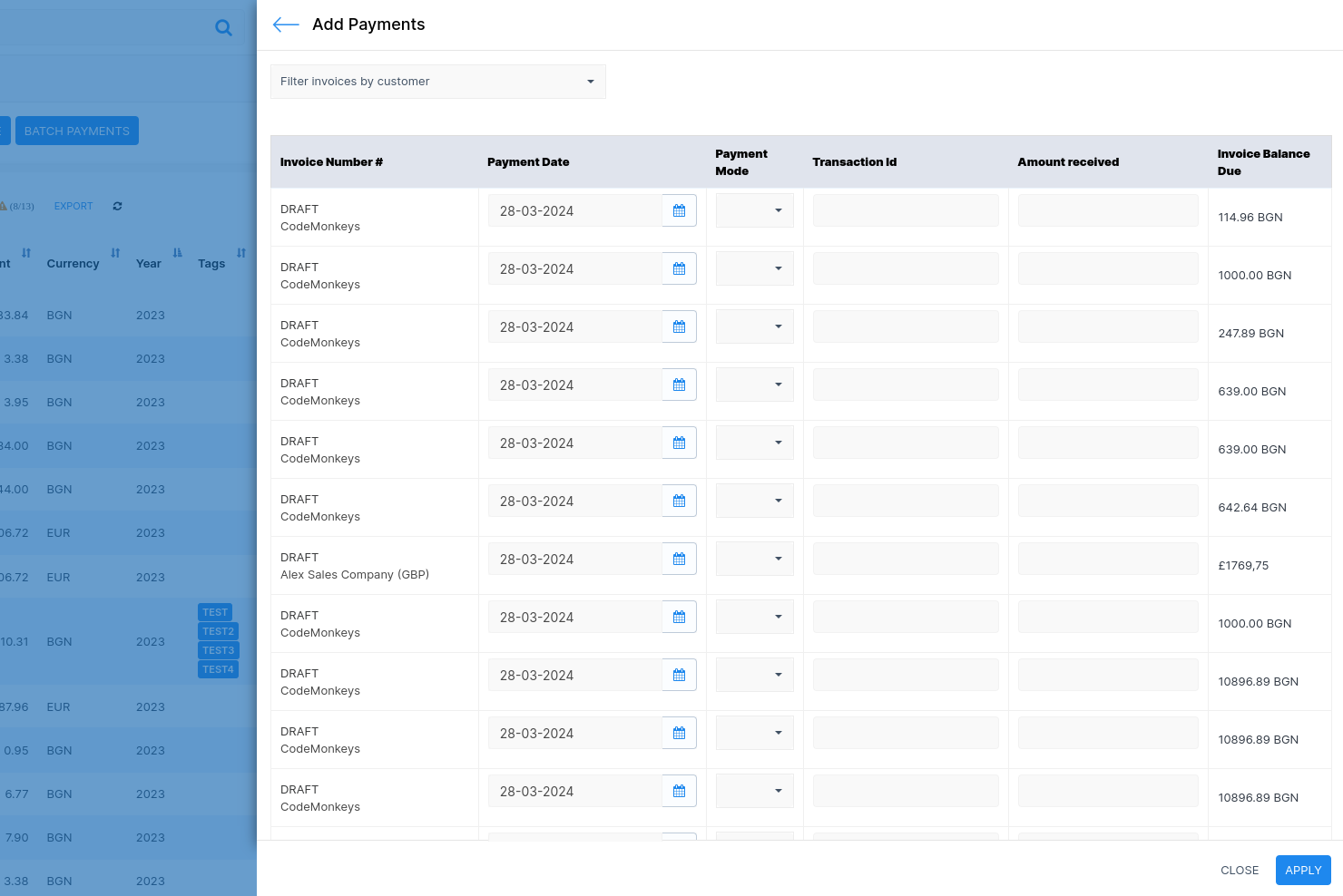 Upon clicking the "BATCH PAYMENTS" button, a slide-in panel will appear from the side of the screen. This panel is where you will proceed to record multiple payments simultaneously.